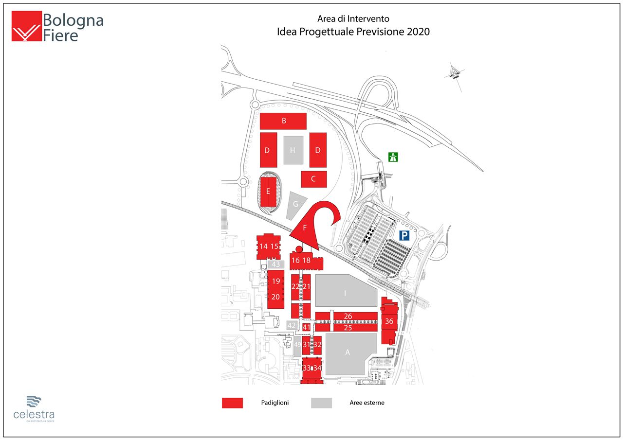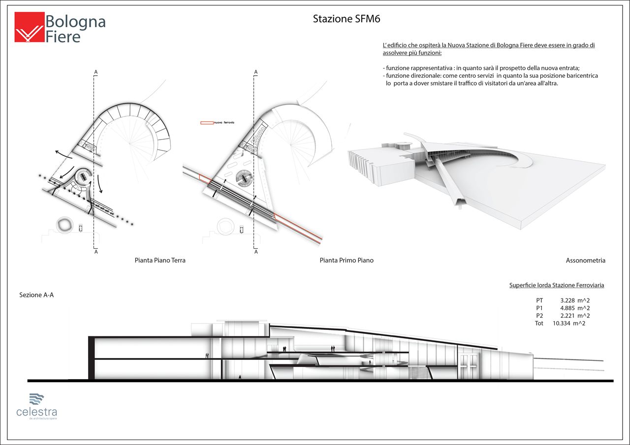 Su tale baricentro è stato pensato di ubicare, in corrispondenza della quota della ferrovia, la nuova stazione di Bologna Fiera, creando nella parte sottostante il grande atrio di ingresso alla Fiera.